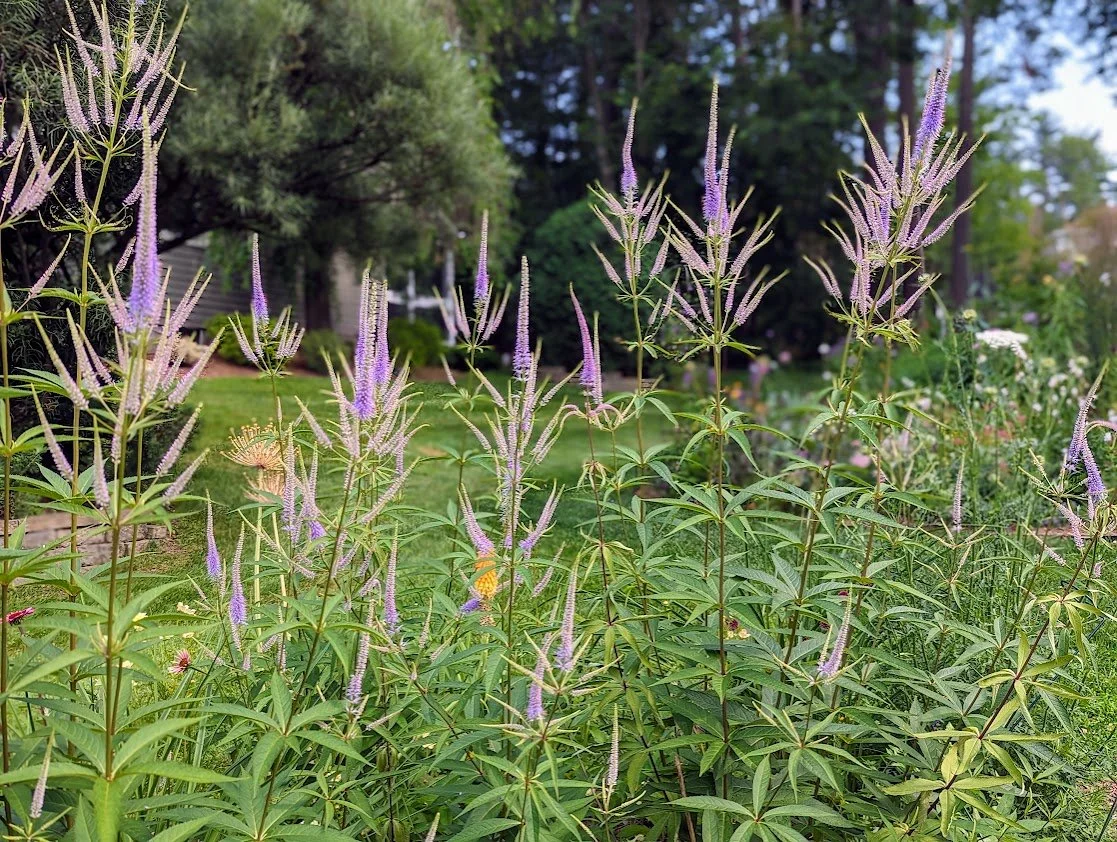 I used to select plants for my garden solely based on their ‘pretty factor’. Over time, I amassed a collection of lovely plants that really didn’t bring any ‘life’ into the garden. Now, I seek plants for their ‘Wonder Quotient’. In my opinion, our gardens need to go beyond pretty, and plants must serve as food (pollen, nectar and foliage) to sustain native wildlife. Beauty + Wildlife Support = Wonder. The good news is this: plants with high Wonder Quotients can also be extremely pretty. We don’t need to sacrifice aesthetics to achieve Wonder. Consider the incredibly beautiful and beneficial veronicastrum. A stalwart in my native pollinator gardens, it competes for the ‘most amazing plant’ award by visitors and pollinators alike during the month of July. Its 4’ tall spikes and see-through nature command attention the moment visitors approach our house.