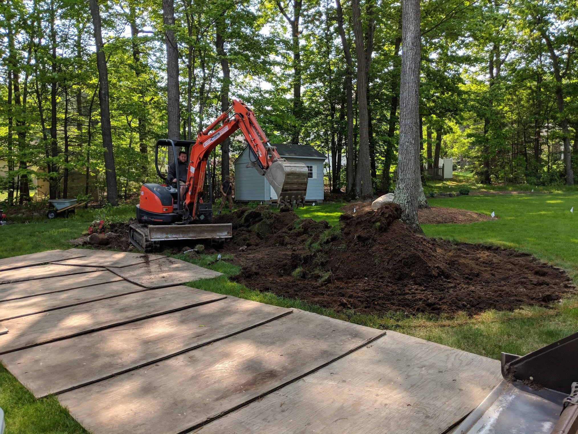 After a damp beginning here in southern New Hampshire, the weather Gods graced us with glorious sunshine to end the month of May. Phase 1 began by removing turf to shape the planting area, digging up and then “planting” huge boulders to help create focal points in this large bed. Next came installation of aluminum edging on the back side of the bed to contain the river rock used to divert rain water runoff. Finally, truckloads of a loam/compost blend were hauled in to mound up the planting bed and give it some height. (click and hover on each photo for more information)