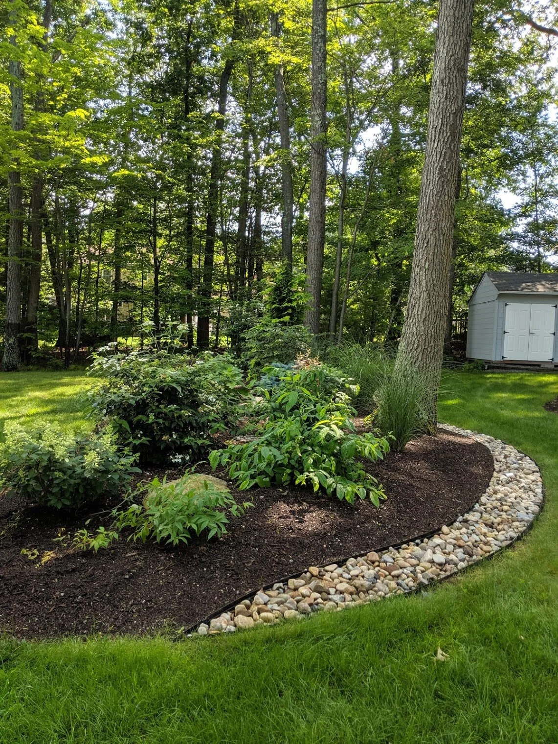The clients (dear friends of mine) wanted to establish a more defined berm along the corner and side of their quite large backyard. There were healthy tall deciduous trees, but no real property definition or privacy screen between their yard and their neighbor’s. The existing plantings consisted of two small areas of mostly mulch and shrubs that were struggling to thrive. The area was calling out for height and structure, color and texture. There was also an urgent need to divert rain water runoff that resulted following changes in grading of the neighbor’s landscape. By the following spring, we were ready to take action!